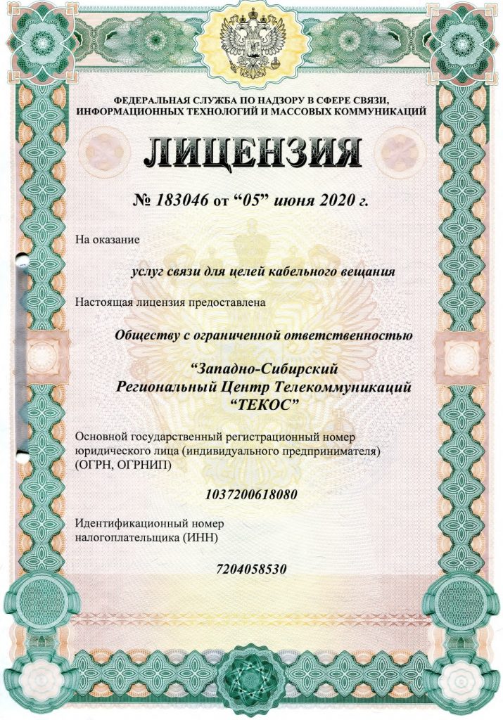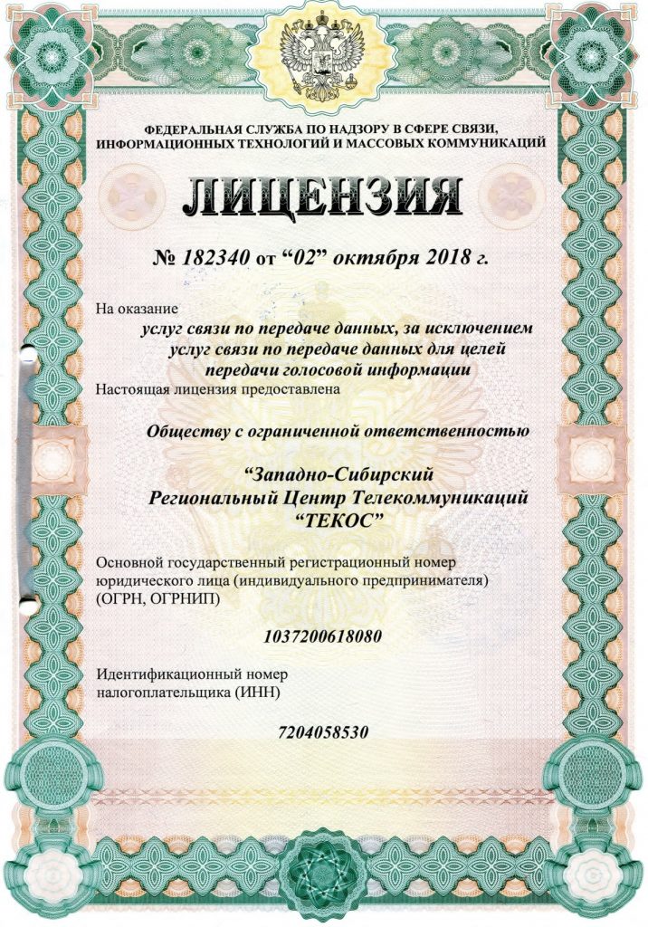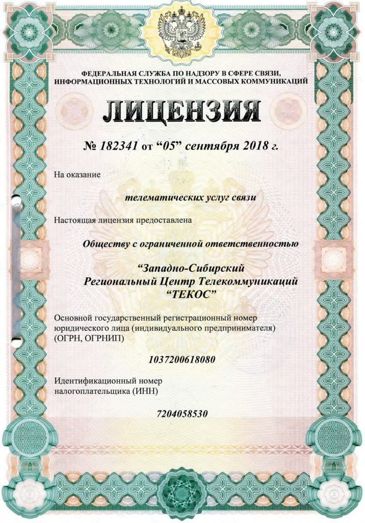 Наша деятельность регулируется лицензией на оказание телематических услуг связи № 182341 от 05 сентября 2018 года и лицензией на оказание услуг связи по передаче данных, за исключением услуг связи по передаче данных для целей по передаче голосовой информации № 182340 от 02 октября 2018 года.